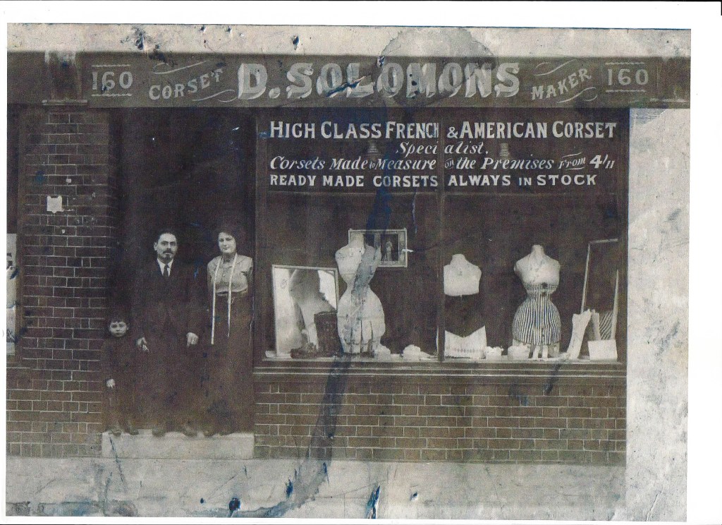 In the late 1800s, Davis Solomons immigrated to London with his wife, Rachel (Tobinschlack). They established a corset business in Cannon Street Road in the East End of London, and lived above the store.